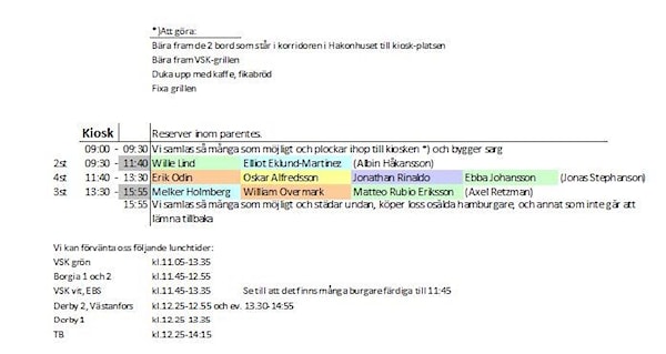 Vi kan ta med kaffetermos och te-termos till eftermiddagen utifall det börjar ta slut. Obs! vi kommer bara till ca: 13:30. Micke, kan du byta pass med oss i kiosken?(Då vi är borta på förmiddagen).