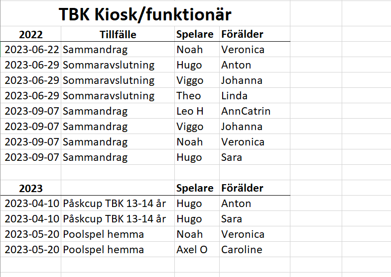 Vid några tillfällen varje säsong behöver vi (klubben) hjälp av föräldrar som tar hand om kiosken. Vi kommer att fördela ut detta och för bok över vilka som hjälpt till, se dokument för detta här på laget.se under "Mer-Dokument". Bif. även en bild i denna nyhet vad som är noterat hittills. På söndag har Leo Helmerssons mamma erbjudit sig att hjälpa till men det behövs en förälder till och denna gång blir det Johan Ljungfalks tur. Kan man inte så byter man själv med någon annan förälder som har barn som spelar på Håsten denna gång, man kan tex. skriva en kommentar i denna nyhet att man önskar att någon annan förälder står i kiosken. Viktigt att vi ledare blir meddelade om ev. förändring så att listan uppdateras med rätt namn. Det som ingår i kioskuppdraget är i huvudsak: - Komma i god tid för att koka kaffe. - Ta fram ev. bord och ställa ut vid planen (vid regn kan kiosken vara i klubbhuset eller vagnen). - Bära fram det som skall erbjudas (dricka, kexchoklad mm) - Ställa tillbaka och diska upp termos mm. Vår förhoppning är att man skall kunna se sitt barn spela samtidigt som man sköter kiosken. Med vänlig hälsning Ledarna P11 - 2014 29 aug 2023 0kommentarer