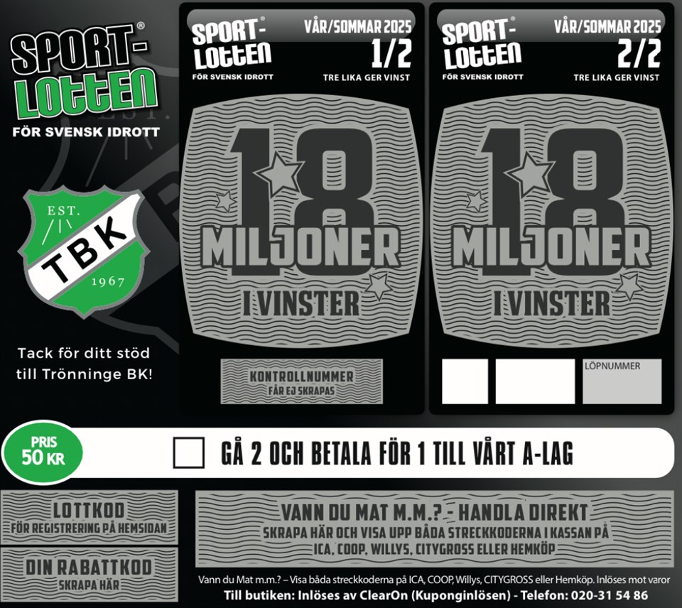 Föreningen har hĂ€mtat hem lotter för att alla lag ska fĂ„ en möjlighet att tjĂ€na lite pengar till lagkassan. Detta Ă€r sĂ„klart frivilligt frĂ„n föreningens sida, men en möjlighet för laget. Lotterna kostar 50 kr dĂ€r hĂ€lften gĂ„r till inköpet av lotten för föreningen och andra halvan direkt till lagets kassa. Lotten innehĂ„ller en skraplott men varje lott har ocksĂ„ en hel del rabatter. Till exempel: 5% pĂ„ Ica Hajen 50kr om du handlar för över 500kr pĂ„ Coop 20% pĂ„ Intersport med mera