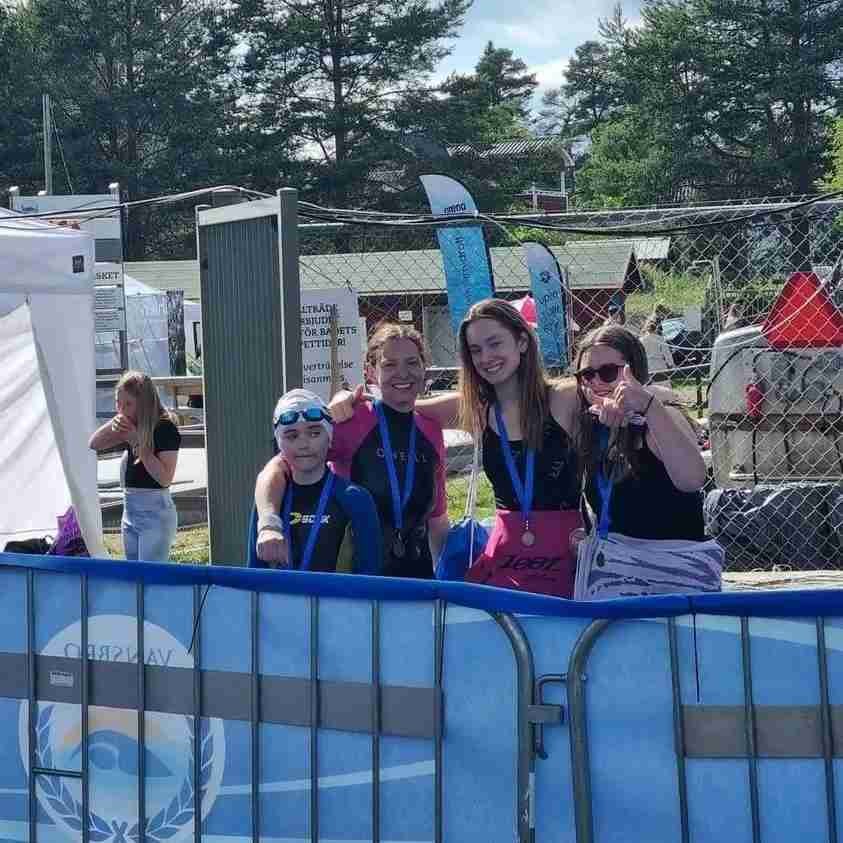 Och där gick gäng nr 2 i mål på öppet älv 3000m i Vansbro. Familjen Englund med Joline, Denise, Evelin och Maria var det denna gång som simmade. Detta gäng hade ösregn på väg till starten som sedan avtog och sprack upp till solsken mellan molnen. Men lite kyligare vatten, drygt 18 grader. Glada och trötta tog de sig i mål allihopa. Maria och Evelin simmade för första gången. Starkt av Evelin, som fyller 10 år senare i sommar, att simma 3000m i öppet vatten för första gången på tiden 1.45.51! Denise som simmade vansbrosimningen för andra gången kapade förra årets tid med hela 10 minuter! Och Joline vann klubbkampen andra året i rad med tiden 51.29, en kapning av förra året med 2,5 minut!