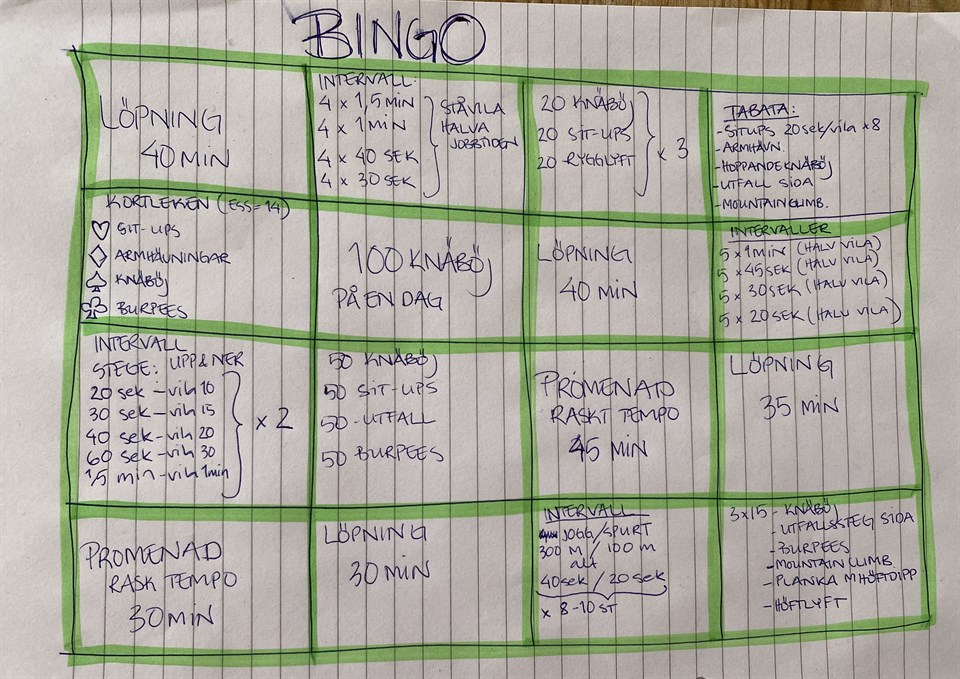 Sista veckan med egen träning innan vi åter ses för gemensamma pass! Denna vecka gäller BINGO. Jag utmanar er i att samla ihop minst fyra valfria pass. Och får du Bingorad, ja då är du ju riktigt grym!!! Lycka till!! Damer D2 31 jul 2023 0kommentarer