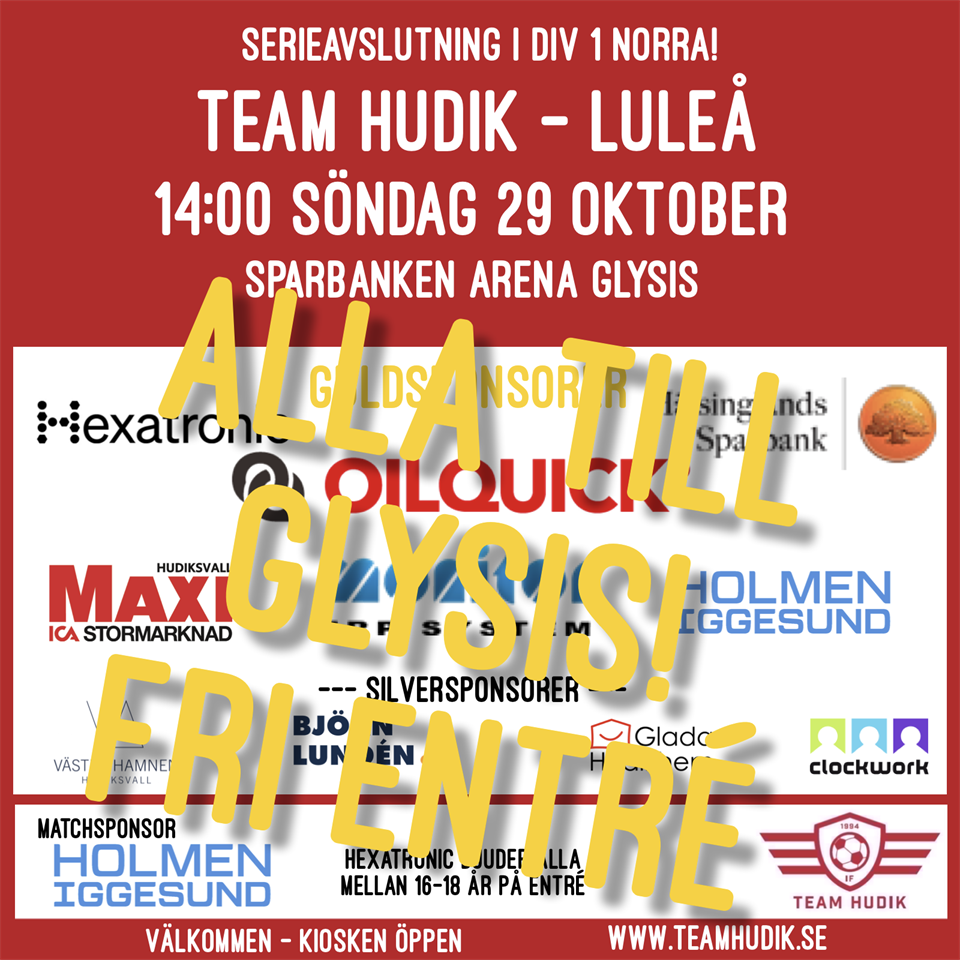 Välkommen till Sparbanken Arena kl 14:00, nu på söndag 29/10 då vårt damlag tar emot gästande Luleå DFF i div 1 Norra. Ditt stöd är viktigt, så kom och se matchen, ta en fika och följ spelet på plats. Hexatronic bjuder alla upp till 18 år på fri entré och IF Team Hudik bjuder alla övriga, så hjälp oss fylla läktaren och stötta laget! Holmen är dagens matchsponsor och finns på plats för att utse matchens lirare i båda lagen. Hoppas att vi ses på söndag på läktaren. Kan du inte vara på plats, följ och stötta via appen Min Fotboll! F15/2009 26 okt 2023 0kommentarer