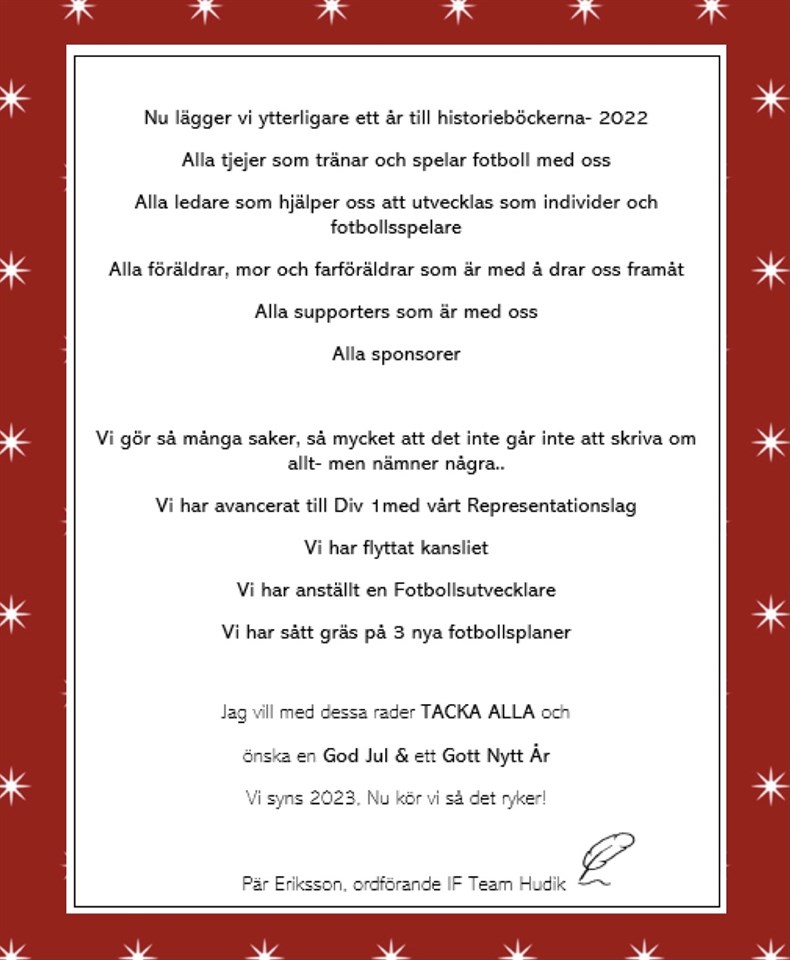 Tack för ett fint fotbollsår! Se bifogad hälsning från ordf. Pär Eriksson F15/2009 23 dec 2022 1kommentar