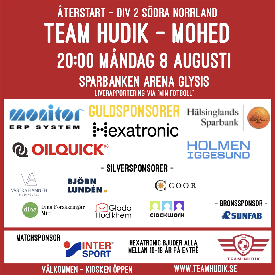 Välkommen till Sparbanken Arena kl. 20:00 på måndag. Mohed gästar oss i Höstomgångens första hemma match i div 2. Matchsponsor är Intersport Hudiksvall. I kiosken finns dryck och annat gott. Vi ses!