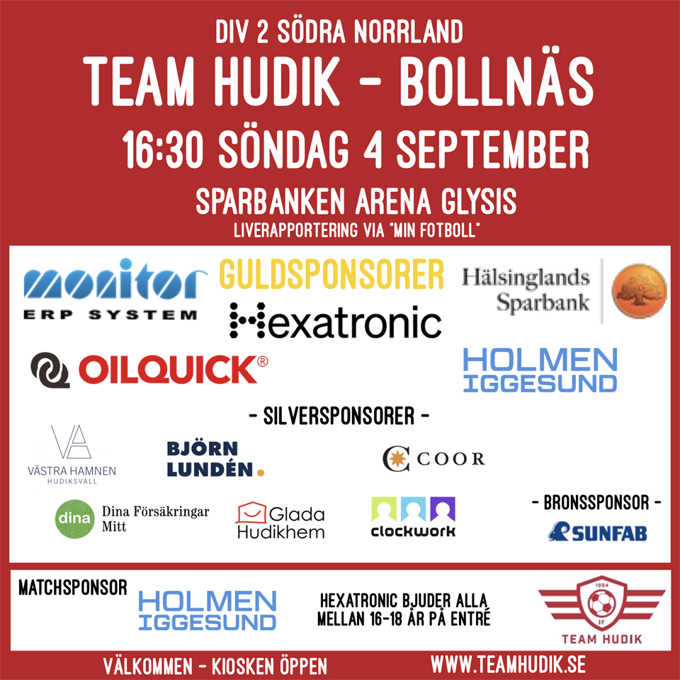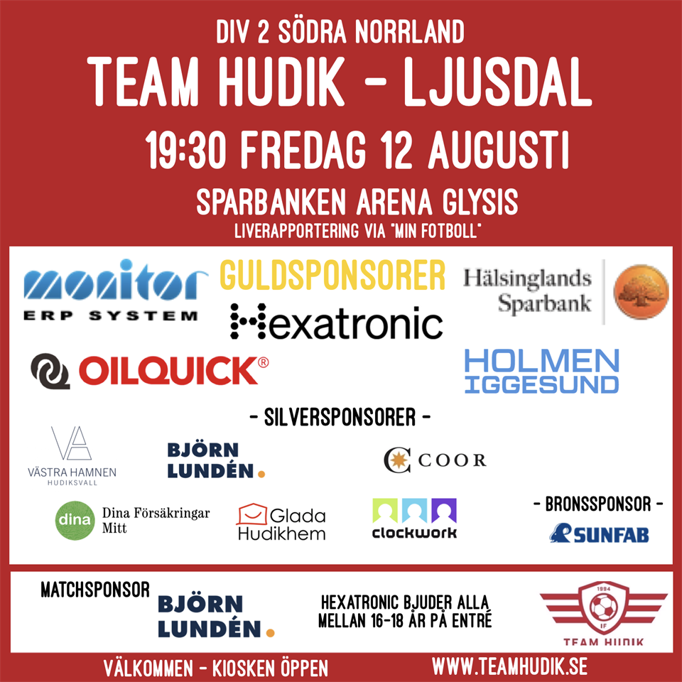 Välkommen till match i Div 2 Södra Norrland mellan Team Hudik och Näsviken. Boka in matchen som startar kl 19:00 nu på fredag 23 september och spelas på Glysis Sparbanken Arena. Hoppas att ni följer och stöttar oss på plats! Förra årets hemmamöte lockade storpublik. Hoppas att just DU kan få oss att överträffa det. Kiosken erbjuder kaffe, kaka, varmkorv, toast och annat gott. Allt för att du ska må bra från läktarplats:) Mål rapporteras i Min Fotboll, så ladda gärna ner appen om du inte kan vara på plats. OilQuick är kvällens match och bollsponsor. Välkomna på Derby!