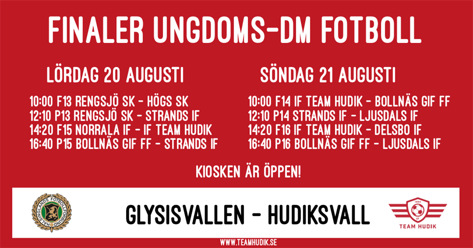 I helgen avgörs det vilka lag och föreningar som tar hem DM segern i åldrarna F/P 13 år upp till F/P 16 år. Matcherna spelas på Glysis naturgräsplan under lördag och söndag. IF Team Hudik arrangerar finalerna i samarbete med Hälsinglands FF, och önskar Er välkomna till Glysis. Kiosken är öppen hela helgen och erbjuder dryck, fika, korv, toast mm. Vi ses!