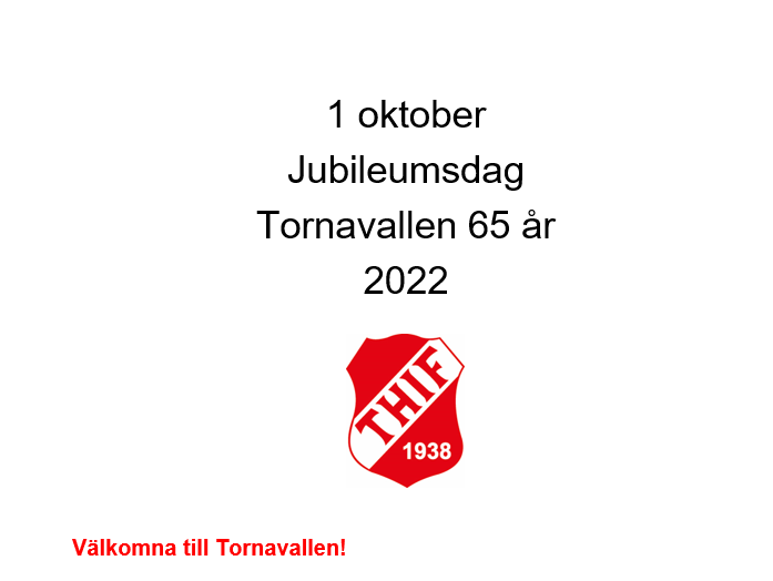 Välkomna till Tornavallen! Lördag 1 oktober 10:00 Tennis: Blixtdubbelturnering med olika medspelare. Bara kom ner! 11:00 Fotboll: Pojk o Flick födda 12-13 (P10) möter Sandby IF 12:00 Pumptrack: Uppvisning och provapå 15:00 Fotboll: Damseniorerna möter Ljungbyheds IF. Sista hemmamatchen Kiosken öppen under dagen fika, falafel, grill och glass Livemusik Klubbhuset är öppet Utställning: Tornavallen 65 år Kom och titta på vårt fina nyrenoverade klubbhus. Vi ses på Tornavallen! Hälsningar THIF Styrelse