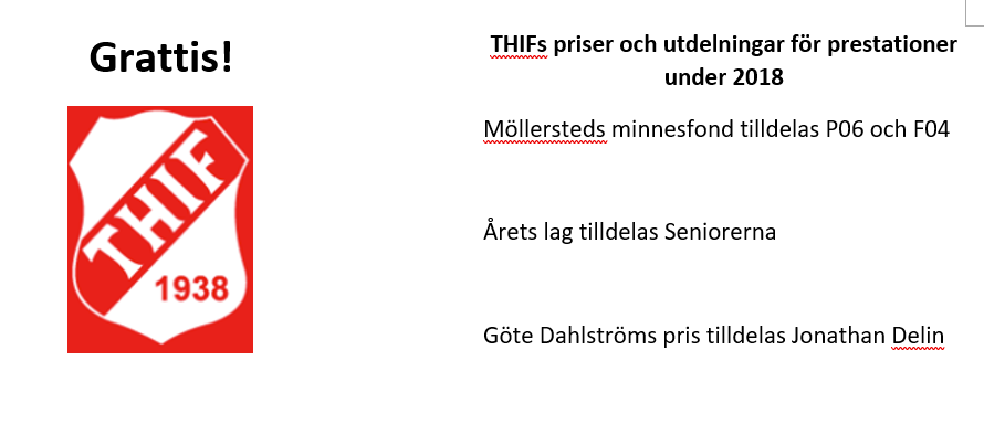 Grattis! För prestationer under 2018 delas följande priser ut Möllersteds minnesfond Katergori: Att man arbetar för lagsammanhållning. 1000kr Går till P06 och F04 med 500kr vardera Årets lag Kategori : En prestation i Serien eller i Cuper 500kr Går till Seniorerna Göte Dahlströms pris Kategori : För unga ledare 500kr Går till Jonathan Delin /Styrelsen F-04 26 feb 2019 0kommentarer