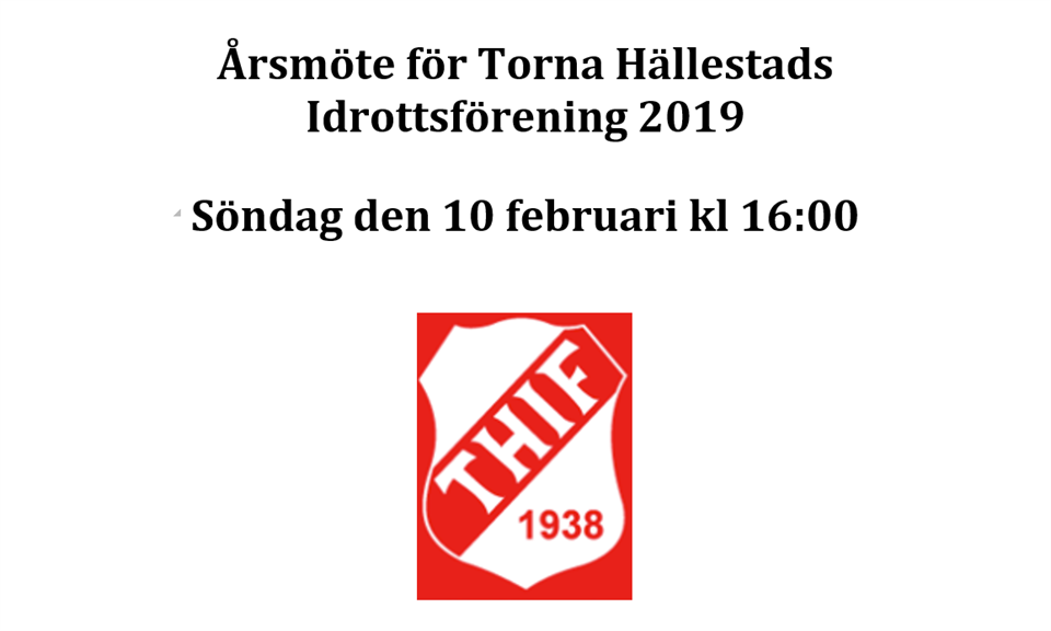 Årsmöte för Torna Hällestads Idrottsförening 2019 Söndag den 10 februari kl 16:00 Söndagen den 10 februari kl 16:00 håller Torna Hällestads Idrottsförening årsmöte i klubblokalen på Åsdalsvägen 5. Motioner till årsmötet skall vara styrelsen till handa senast 14 dagar före (dvs 2019-01-27), skickas till sekreteraren på hans e-post mats@thif.se eller per brev till Mats Svensson, Byvägen 8, 247 45 Torna Hällestad. Varmt välkomna! Styrelsen F-04 18 jan 2019 0kommentarer