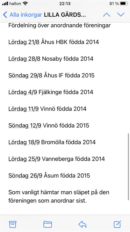 Hejsan alla. Hoppas att ni har det bra i sommarvärmen. Ville bara informera er om att jag anmält ett lag till Lilla gärds cup nu i höst. Vi kommer alltså sammanlagt spela 6 lördagar. Tre manna spel. Kommer därför att vara 6 spelare som blir uttagna per gång. Turas om. Skickar med bild på spelschemat, obs läs PF14. Man spelar tre till fyra matcher varje gång. Viktigt att ni meddelar om ert barn inte vill vara med och spela. Om man inte kan vara med så byter man själv med någon i laget. Dock viktigt att meddela mig när byter är gjort. Kommer berätta mer vid nästa träning som sker 18/8. Fortsatt trevlig sommar// Daniel F11/12 Fotboll 19 jul 2021 0kommentarer