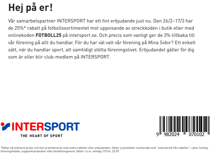 Hej! Vår samarbetspartner INTERSPORT har ett fint erbjudande just nu. Den 26/2–17/3 har de 25%* rabatt på fotbollssortimentet mot uppvisande av streckkoden i butik eller med onlinekoden FOTBOLL25 på intersport.se. Precis som vanligt ger de 3% tillbaka till vår förening på allt du handlar. För du har väl valt vår förening på Mina Sidor? Ett enkelt sätt, när du handlar sport, att samtidigt stötta föreningslivet. Erbjudandet gäller för dig som är eller blir club-medlem på INTERSPORT. Måns Nilsson, Fotbollens kansli Tollarps IF P13 Fotboll 5 mar 2024 0kommentarer