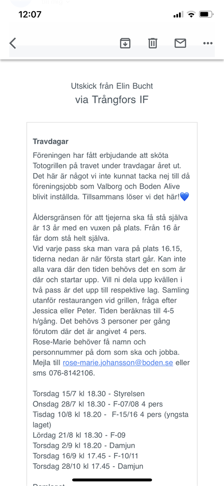 Hej! Alla har fått ett Mail från föreningen gällande jobb på travet. (Bifogar en skärmdump så ni kan läsa ifall ni missat mailet :) Ni som står på tur att jobba då, torsdag 28/10 är Julia och Tindra med varsin vuxen. (Skulle det behövas fler vuxna är Olivia nästa på tur) Om ni inte kan får ni lösa det med eget byte 😊