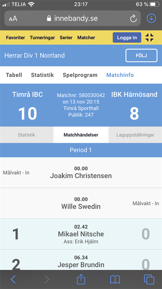 Kvällens heta derby mellan Timrå IBC-IBK Härnösand slutar efter en riktig rysare 10-8 efter periodsiffrorna (4-1,1-3,5-4). Ett laddat timrågäng tog direkt kommandot inför en härlig hemmapublik och redan efter 2.42 hade matchens spelare Mikael Nitsche gett hemmalaget ledningen efter assist Erik Hjälm. Ett par minuter senare utökade Jeppe Brundin till 2-0 efter fint förarbete Oskar Lund. Knappa 12 minuter in utnyttjar Härnösand ett misstag och reducerar till 2-1. Sedan utökas ledningen till 3-1 då Nitsche på en frislagsvsriant stänker in 3-1 på pass Oskar Lund och klockan hade då tickat upp till 15.36. Två minuter senare kommer matchens första utvisning(långt ifrån den sista skulle det visa sig) då bortalaget åker ut för fördröjande av spel. I PP är vi vass det vet vi och 4-1 gör Daniel Sjöblom åter var det Oskar Lund som ligger bakom. I slutet av perioden åker Härnta på ytterligare en utvisning som innebär att vi får börja i PP i inledningen av den andra. Ledningen utökas då till 5-1 åter genom Daniel Sjöblom på en delikat genomskärare från Oskar Lunds klubba. Därefter år det vi som drar på oss utvisningar och både 5-2 och 5-3 kommer i PP för gästerna. Efter 7.07 kommer ytterligare 1 reducering då Jonatan Widerström skjuter 5-4 men i samband med firandet av det målet åker han ut 2+10 minuter för osportsligt uppträdande. Inget mål den gången och samma resultat för gästerna efter att Jonas Lundahl uppsökt syndabåset. Periodvila och ett mål upp inför den sista akten. 3.35 kvitterar Hsand till 5-5 genom Joel Svedberg innan det åter var dags för gästerna att åka ut för obstruktion på gamla timrå bekantingen Stefan Wallman efter dryga 4 minuter spelade. Halvminuten senare smäller 6-5 in då Daniel Sjöblom skjuter in sitt tredje mål för kvällen assisterad av Jonas Lundahl. 2 minuter senare åker Erik Hjälm på en utvisning för upprepade förseelser och då kommer ännu en kvittering genom gästernas bästa spelare Stefan Westman. Blott ett antal sekunder efter kvitteringen drabbas vi av ytterligare en tvåa och då för gästerna 6-7 efter 8.15 av den tredje perioden. TIO sekunder hinner gå innan Wille Nylund kvitterar till 7-7 på pass Macke Alm. Dryga 11 minuter in återtar vi ledningen efter ännu en frislagsvariant genom Erik Hjälm(Oskar Lund). Med klockan på 16.20 får Mikael Nitsche bollen mitt i slottet och prickskjuter in sitt tredje och Timrås nionde mål för kvällen. Knappa halvminut senare spelar Sille Nylund fram Macke Alm som direktskjuter in 10-7 till hemmalaget. Därefter drabbas vi av 2 ytterligare utvisningar men närmare en 10-8 genom Hampus Svensson med 18 sekunder kvar kommer inte gästerna idag.Timrå IBC tar en mycket efterlängtad seger i en gastkramande tillställning inför en fantastiskt härlig publik som levde sig med i matchen. En match som blev sönderryckt av alla utvisningar och där PP uppställningarna i de bägge lagen skördade stora framgångar. Vår första femma var grymma framåt idag och i övrigt en härlig krigarseger rakt igenom. Nu match redan på lördag då vi beger oss till Umeå och en härlig match mot IBF Dalen. A-lag Herrar 13 nov 2019 0kommentarer