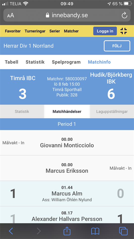 Gårdagens match mellan Timrå IBC-Hudik/Björkberg IBK slutar 3-6 efter periodsiffrorna (2-1,0-4,1-1). Vi tar tidigt ledningen med 1-0 då Wille Nylund spelar fram Macke Alm som vackert lägger in en backhand bakom H/B målvakt. Kvitteringen kommer dock dryga 8 minuter in i perioden genom vassa Alexander Halvars Persson. I slutet av perioden återtar vi dock ledningen igen då Erik Hjälm från vänsterkanten prickskjuter in 2-1 lågt i bortre hörnet och där assistpoängen ges till Robin Wiik. En helt okej insats så långt. I den andra perioden blir det som så många gånger förr en betydligt sämre insats från vår sidal. Efter 4 minuter kvitterar H/B på ett skott utifrån genom Olof Pettersson och 2,5 minut senare blir det ett identiskt mål av samma kille. I bytet efteråt räknar vi inte in rätt i vår press och gästerna får ett friläge som Jesper Wiklund inte gör något misstag med. Vi går i mitten av perioden ner på lite folk och ändrar lite i formationerna. Tyvärr blir det även 2-5 innan Hesa Fredrik ljuder och en dålig andra period från vår sida var till ända. I den tredje perioden skapar vi många bra lägen utan att sätta dit den och istället utökas gästernas ledning till 2-6 efter dryga 6 minuters spel. 13 minuter in i perioden kommer matchens första utvisning och den drabbar H/B och i efterdyningarna av detta PP reducerar Wille Nylund till 3-6 assisterad av Oskar Lund och klockan var då 15.13. Med 2 minuter kvar tar vi en timeout för att göra en sista kraftansträngning men vi kommer inte närmare än nära utan det blir gästande serieledarna som tar med sig alla 3 poängen hem till Hudik. Förutom den andra perioden gör vi en rätt skaplig match ändå med Macke Alm som stack ut lite extra denna kväll inför dryga 300 åskådare. Nästa helg väntar en otroligt viktig 6 poängs match då vi beger oss till Öbacka Sportcenter och derby mot IBK Härnösand.