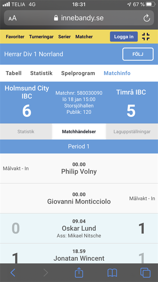Dagens match mellan Holmsund City-Timrå IBC slutar 6-5 efter periodsiffrorna (1-1,3-2,2-2). Nio minuter in i matchen tar vi ledningen med 0-1 efter att Oskar Lund styrt in Mikael Nitsches skottpass i öppen kasse. I slutet av perioden kvitterar hemmalaget snyggt på ett frislag. En period som vi växte in i och tog över allt eftersom och vår unga tredje kedja (Aune,Göthe,Davve) med Alex och Jadevall snurrade friskt med hemmalaget något som dom gjorde under stora delar av matchen. I den andra perioden tar hemmalaget ledningen efter 3 minuter men vi kvitterar då Hampus Strömberg snyggt assisterar Wille Nylund till 2-2 efter 5.37. Repliken kommer dock omgående och även 4-2 skulle komma efter dryga 13 minuter spelade. Innan perioden var till ända spelar Oskar Lund ett vackert diagonalpass till en fristående Robin Wiik som direktskjuter in 4-3 målet som är ett resultat som står sig perioden ut. I början på den tredje drabbas vi av matchens första utvisning men istället för mål i baken kontrar Hampus på egen hand snyggt in 4-4 efter 3.19 spelade. Knappa 3 minuter senare drabbas vi av ännu en utvisning för upprepade förseelser men vår för dagen fantastiska box med Willner,Hultberg bakom Wille,Hampus/Lund,Nitsche löser detta på ett fantastiskt bra sätt. Ledningsmålet för hemmalaget kommer istället efter 8.15 då dom lite för enkelt får traska in framför vårt mål. Även 6-4 kommer då knappa 14 minuter var spelade men vi hade fortfarande bra go i laget. 16.04 spelar Jonas Lundahl fram Hampus som reducerar till 6-5 och nu hade vi mängder av kvalificerade målchanser. Med 1 minut kvar tar vi en timeout och plockar ut en bra spelande Gio i kassen och chansar på spel 6-5. Tyvärr räcker det inte ända fram utan det blir ännu en hedersam förlust med uddamålet trots att vi i mina ögon var det klart bättre laget ännu en gång. Bara bita i det sura äpplet och börja ladda för kommande helgs match då vi tar emot topplaget FBC Bollnäs med Ciya Hajo i spetsen hemma i Timrå sporthall. Söndag den 26 januari klockan 15.00! Hoppas på stort publikstöd för nu behövs det verkligen. A-lag Herrar 18 jan 2020 0kommentarer