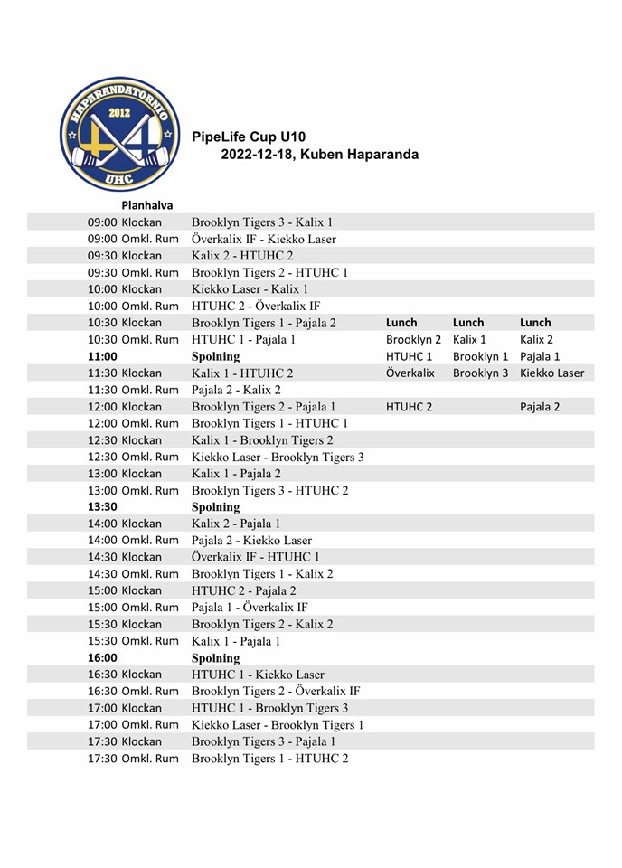 Här kommer lite info gällande söndagens cup. Det blir en tidig morgon för att vi ska kunna samåka och därmed spara in en bussresa. Bussen till Haparanda avgår kl. 05.30 söndag morgon från snells arenan. Därefter hoppar U10 av i Haparanda och U11 fortsätter med bussen till Kalix där vi har sammandrag. Efter sammandraget kommer vi till Haparanda för att hejja U10:orna och efter cupen åker vi alla hem med samma buss ca. kl. 18.30 (eventuellt tidigare) Har ni några frågor eller funderingar är ni välkomna att höra av er till mig. Bifogar även spelschemat för söndagen //Pia U13 13 dec 2022 0kommentarer