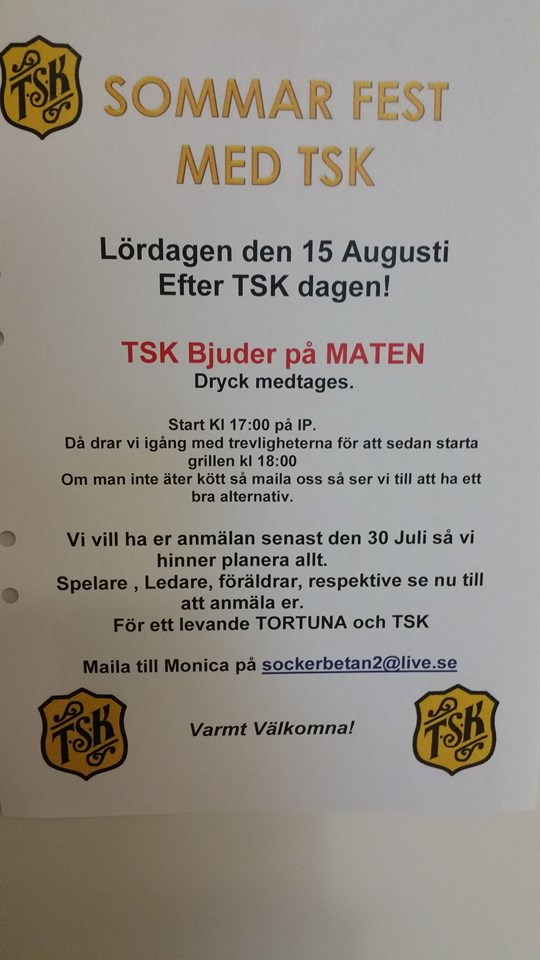 Nu har vi fått spelschema för nästa cup som är den söndag 9:e augusti i Strängnäs. Jag har lagt in spelschemat under dokument. Första matchen börjar kl. 9.00. Vi återkommer närmare med samlingstid. Vi skulle behöva veta vilka som kan vara med på denna cup så meddela detta här på sidan. Mer info kommer. Vi kör igång med träningar igen tisdag 4 augusti kl. 18.15. Vill även passa på att informera lite om TSK-festen lördag 15/8 som kommer vara efter TSK-dagen. Vi ser gärna att alla som har möjlighet kommer. Info se bild. Ha en skön sommar och semester så ses vi i Augusti igen! // Sara F-07/08 10 jul 2015 4kommentarer