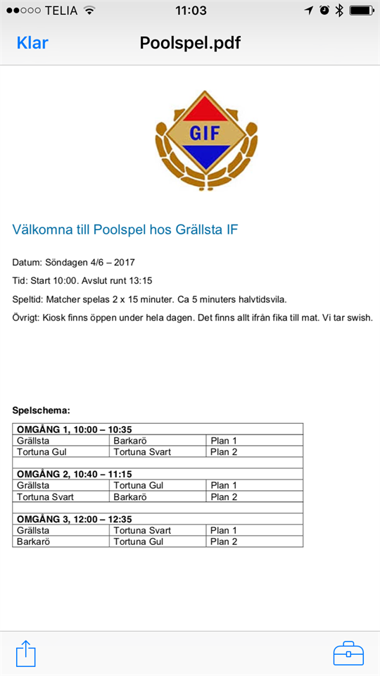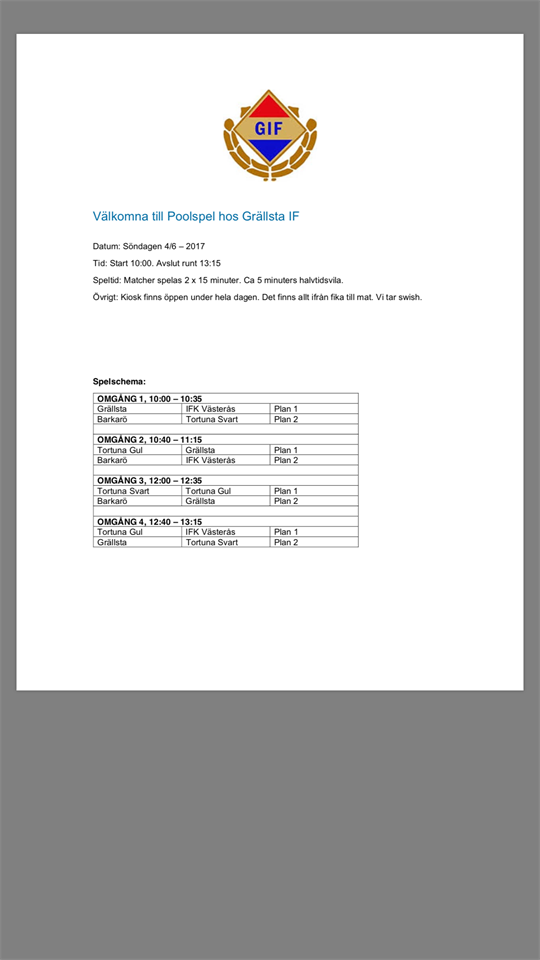 Spelschema inför morgondagen, Poolspel Grällsta IF