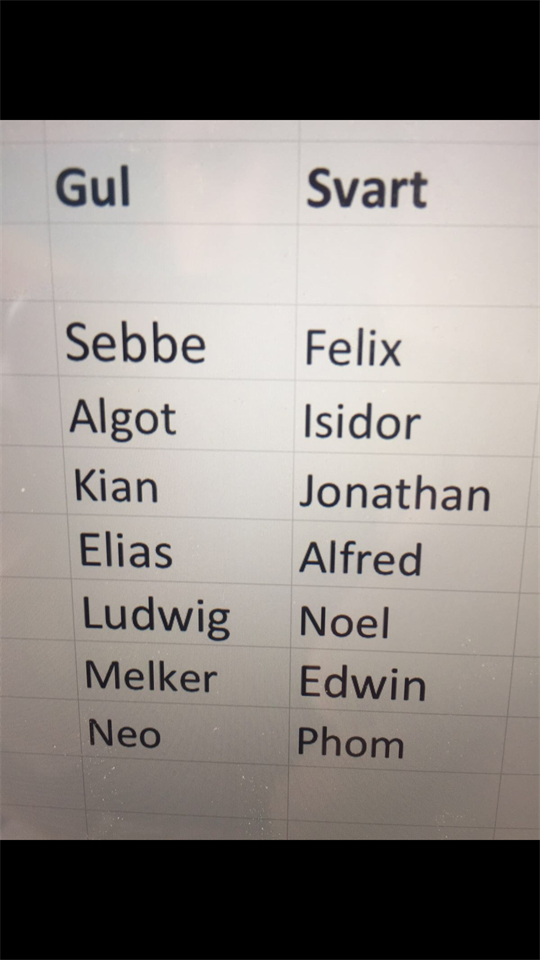 Hej igen, Här kommer lagindelningen inför morgondagen. Tsk svart samling kl 9.30 för att göra sig redo för matchstart kl 10.00. Tsk gul samling kl 10 för att göra sig redo för matchstart kl 10.40. Vi ses imorgon! Hälsningar Tränarna