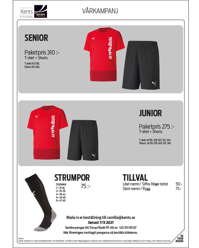 I VÄNTAN PÅ ATT VI KAN PRESENTERA VÅR NYA KLUBBPROFIL MED NY OCH SNYGG KLUBBOVERALL KOMMER HÄR NU EN KAMPANJ PÅ SHORTS OCH T-SHIRT 😊 KAMPANJEN GÄLLER TILL DEN 7 MAJ SEDAN BESTÄLLS KLÄDERNA. I OCH MED DOM RÅDANDE OMSTÄNDIGHETERNA SÅ HAR PUMAS NYA KOLLEKTION BLIVIT FÖRSENAD OCH VÄNTAS KOMMA IN I BÖRJAN JUNI. NI KAN ÄVEN BESTÄLLA KLÄDER FRÅN VÅR KLUBBPROFIL, SE KLÄDERNA UNDER DOKUMENT OCH KLUBBPROFIL 2021 PÅ VÅR HUVUDSIDA. UNDRAR NI NÅGOT SÅ KONTAKTA CAMILLA BERGGREN, camilla@kents.se, 0708 44 71 72. FOTBOLLSHÄLSNINGAR TORUP/RYDÖ FF