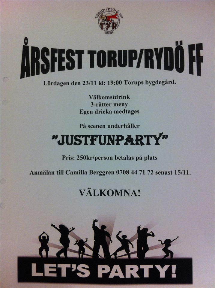 Lördagen den 23/11 kl: 19:00 Torups bygdegård. Välkomstdrink 3-rätter meny Egen dricka medtages På scenen underhåller ”JUSTFUNPARTY” Pris: 250kr/person betalas på plats. Åldersgräns 15år. Anmälan till Camilla Berggren 0708 44 71 72 senast 15/11. VÄLKOMNA! Damer 21 okt 2013 0kommentarer