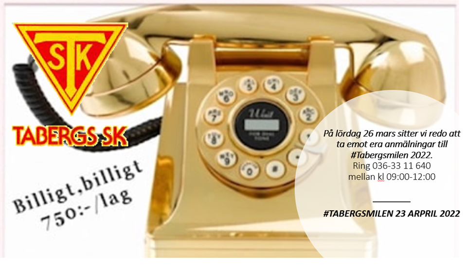 På lördag 26 mars sitter vi redo att ta emot era anmälningar till #Tabergsmilen 2022. Ring 036-33 11 640 mellan kl 09:00-12:00 Dela gärna denna info!! Tabergsmilen 22 mar 2022 1kommentar