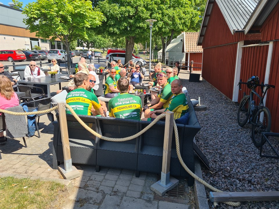 Medlemsinformation 14–2023 Hej Alla Tisdag den 6 juni, Sveriges Nationaldag, har vi kört vi en långtur på LVG. Klockan 09:00 var vi 12 st. som äntrade våra cyklar och drog i väg mot Fröjered. Färden fortsatte mot Fridene, Edåsa, Varola, Tåstorp, Skogsdal, Varola, Värsås, Ingelsby, Hörnebo, Kykefalla, Ruder, Hjo Mejeri, Hjo Hamn. Då hade vi åkt 73 km med 32 km/h i medelfart. I Hjo på fiket Guldkanten möttes vi av tre glada flickor klädda i gult och grönt. De hade bokat plats åt oss vid borden i solen. Vi fikade och hade en trivsam stund tillsammans. Det blev tid får vår sista del av rundan från Hjo via Varpet, Korsberga, Klämmesbo, Håven, Tidaholm. Väl framme kunde vi konstatera att hela rundan blev 108 km lång med ett medel på över 30 km/h. På Håvenrakan snittade vi över 40 km/h med svag motvind. Alla var nöjda och vi tackade varandra för en fin tur i goda cykelvänners anda. Väl mött inför hemmavasan på MTB lördagen den 29 juli 2023. Dick Ljungberg
