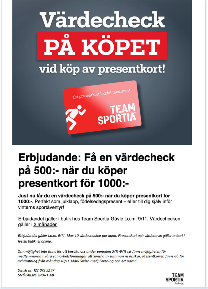 Här kommer ett erbjudande från Team Sportia Gävle!