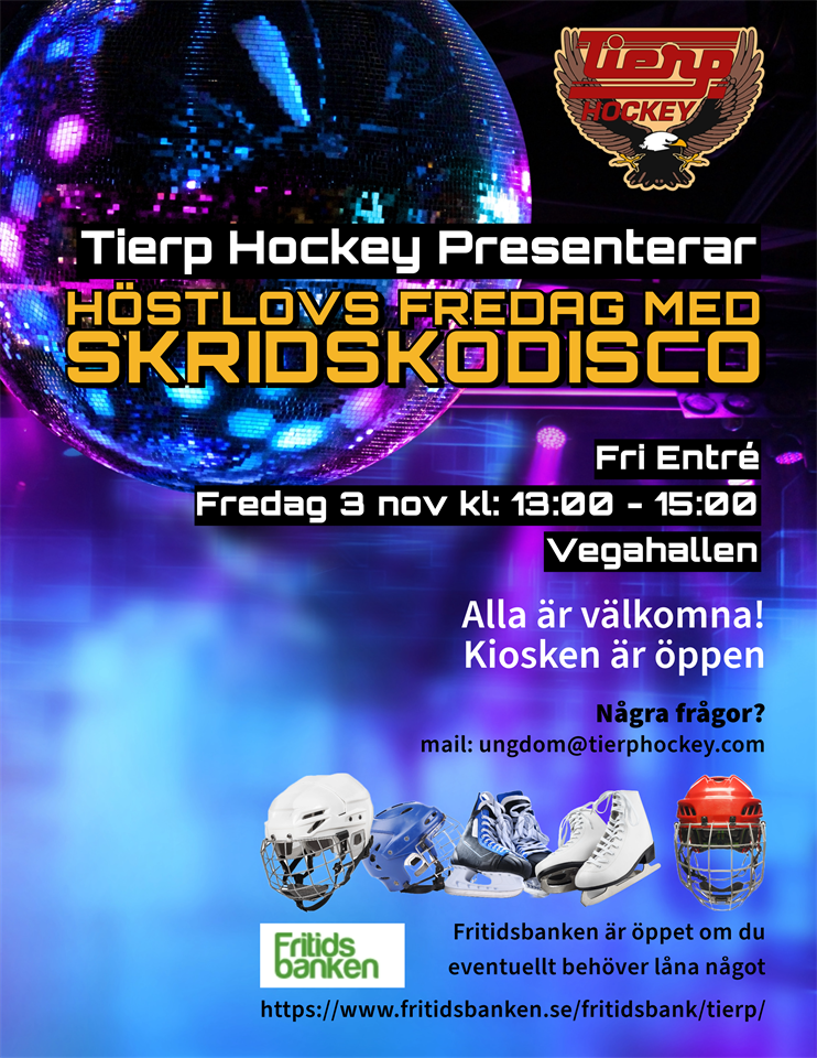 Tierp Hockey arrangerar SkridskoDisco med godisregn Nu på fredag 3 nov Klockan 13:00-15:00 Skridskodisco för allmänheten. Alla är välkomna. Kiosken är öppen. Ledare finns för aktiviteter på isen. TIERP HOCKEY 1 nov 2023 0kommentarer