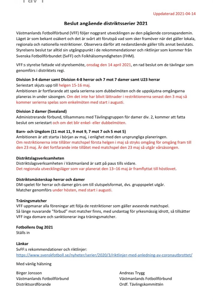 Hej, Igår tog förbundet en rad beslut gällande kommande distriktsserier. Bifogar bild på texten. / Lisa Tillberga IK Fotboll 15 apr 2021 0kommentarer