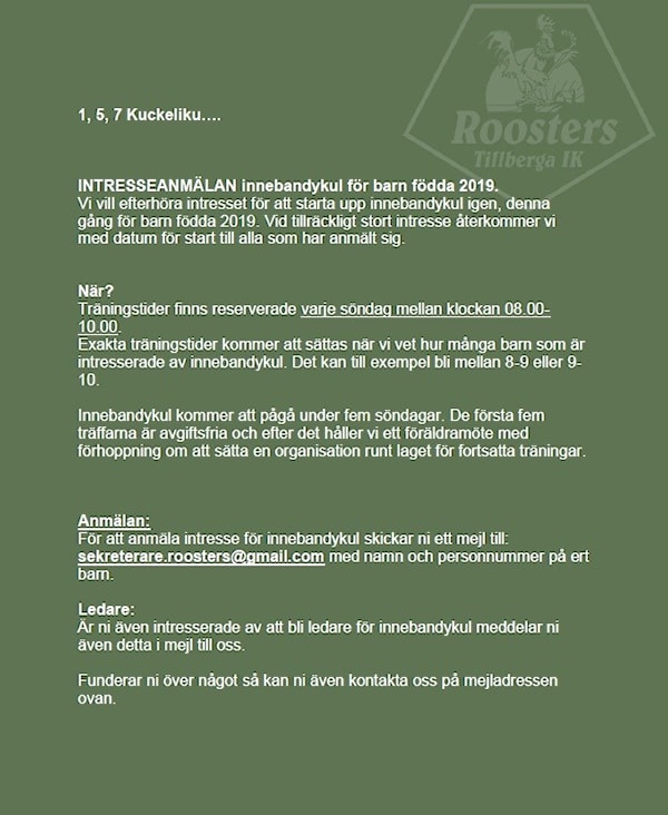 Mejla sekreterare.roosters@gmail.com med ditt barns namn + personnummer. Meddela även om du kan tänka dig att axla rollen som ledare.