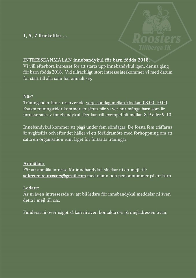 1, 5, 7, kuckeliku! 🐣🐔 Ni med barn födda 2018, se hit! Nu kan ni skicka in en intresseanmälan till sekreterare.roosters@gmail.com om era barn är intresserade av att börja spela innebandy i Tillberga IK Roosters Ungdom. Mer info ser ni på bilden. Återkom gärna om ni har några frågor. Med vänlig hälsning Styrelsen Tillberga IK Rooster 30 sep 2024 0kommentarer