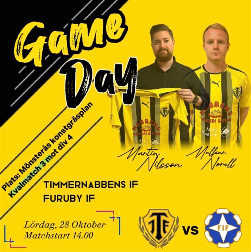 På lördag önskar vi i TIF:s herrlag att vi sluter upp till en sista dans för denna säsong och skapar härliga fotbollsminnen tillsammans! Det har blivit dags för den sista och avgörande kvalmatchen för vår del. Ett kryss räcker för avancemang till div 4 men givetvis går vi för seger! Pga allt regnväder på sistone kommer matchen att spelas på konstgräset i Mönsterås med start kl.14:00. Kiosken då, tänker ni? Oroa er inte, den följer med!😉 Ni är alla hjärtligt välkomna, stora som små, ju fler desto bättre! Sprid gärna vidare! Forza Nabben! Vi syns på lördag!🙏💛 När: Lör 28/10 Tid: 14:00 Plats: Konstgräset i Mönsterås Motståndare: Furuby IF Truppen: Var god se Instagram