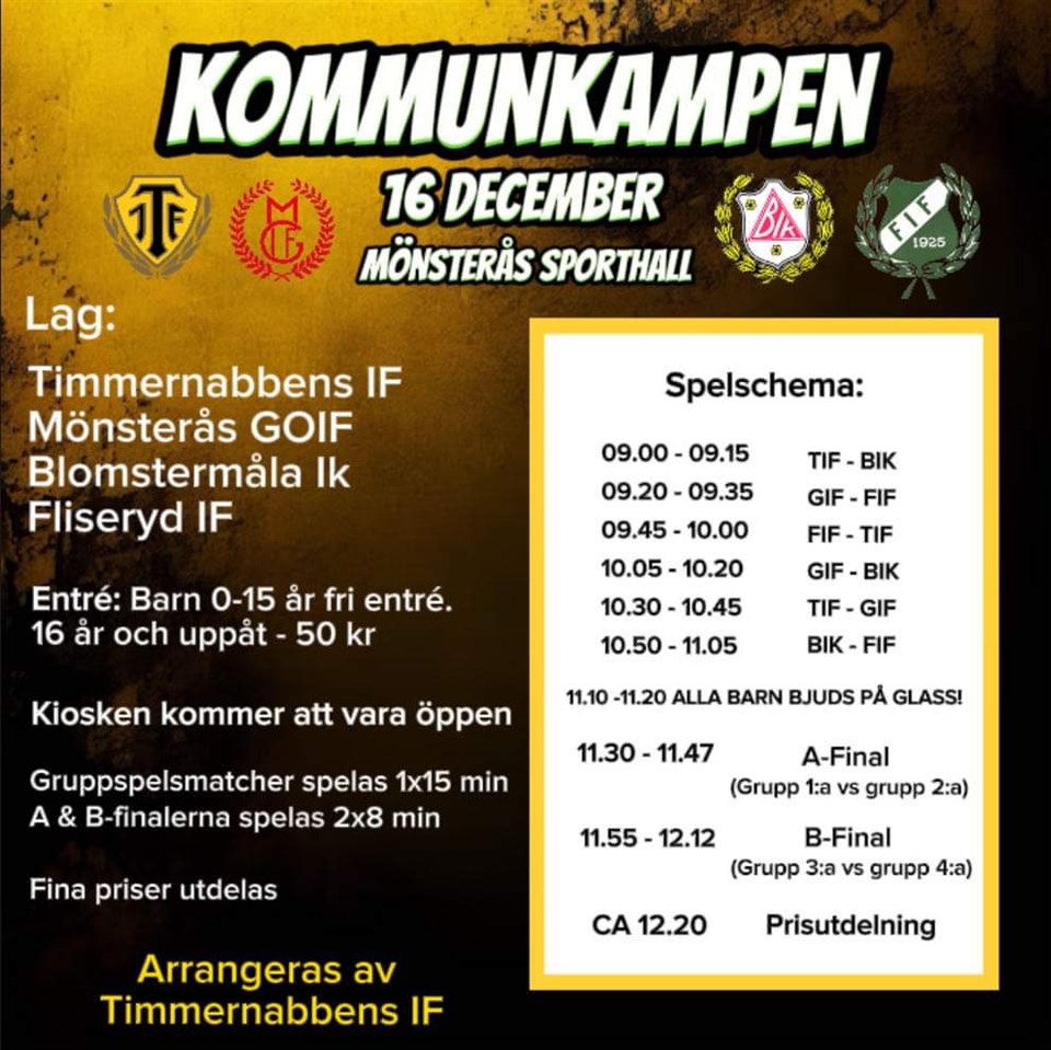 Imorgon, lördag 16/12 går första upplagan av KOMMUNKAMPEN av stapeln. De fyra kommunlagen Timmernabbens IF, Mönsterås GOIF, Blomstermåla IK och Fliseryds IF gör upp i spännande inomhusmatcher i Mönsterås Sporthall (A-hallen) mellan kl.09-13. Ett fullspäckat och intensivt spelschema fyllt med derbyn som avslutas med prisutdelning. Gratis glass till samtliga barn dessutom! Ta er tid och se till att fylla läktarna så skapar vi en härlig stämning tillsammans! Varmt välkomna!