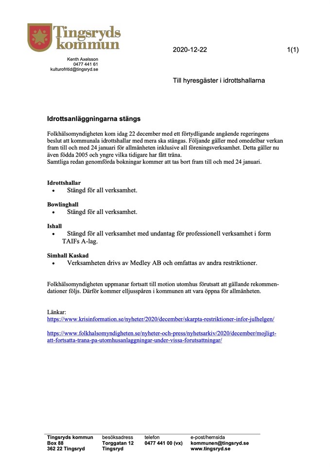 Tingsryds Kommun har idag gått ut med restriktioner gällande barn- och ungdomsverksamhet i kommunens lokaler. Idrottshallar och gymnastiksalar Anläggningarna är bokningsbara för föreningsverksamhet med grupper och lag födda 2008 eller senare. Omklädning till aktiviteten sker hemma. Bokningar för privatpersoner, företag eller föreningsverksamhet för deltagare födda 2007 eller tidigare medges ej. Styrelsen har ikväll fattat följande beslut: * All träning för ungdomar födda 2008 och senare bedrivs som vanligt för de som inte varit bortresta under sportlovet. Styrelsen rekommenderar således de medlemmar som under sportlovet varit bortresta att inte närvara på träningsverksamheten under v.9 för att minimera risken för smittspridning. * All träning för ungdomar födda 2007 och tidigare ställs in under v.9. Fortsatt gäller naturligtvis tidigare utskickade riktlinjer. /Styrelsen