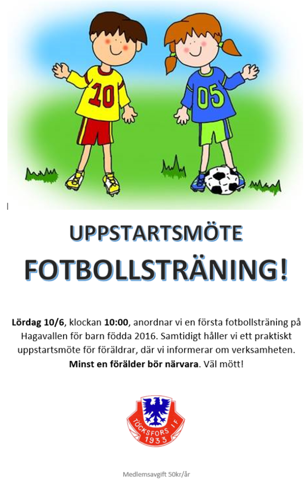 Nu kör vi igång med fotboll för barn födda 2016. Lördag 10/6 klockan 10:00, anordnar Töcksfors IF en första fotbollsträning på Hagavallen. Samtidigt håller vi ett praktiskt uppstartsmöte för föräldrar, där vi informerar om verksamheten. Fotbollsträningen är gemensam för pojkar och flickor denna första träning. Då det var ett generellt lågt intresse bland flickor födda 2015, är även de välkomna denna dag - om man såsmåningom vill spela i ett flicklag.