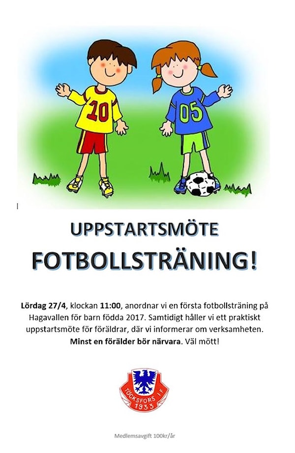 Nu kör vi igång med fotboll för barn födda 2017. Lördag 27/4 klockan 11:00, anordnar Töcksfors IF en första fotbollsträning på Hagavallen. Samtidigt håller vi ett praktiskt uppstartsmöte för föräldrar, där vi informerar om verksamheten. Fotbollsträningen är gemensam för pojkar och flickor denna första träning.