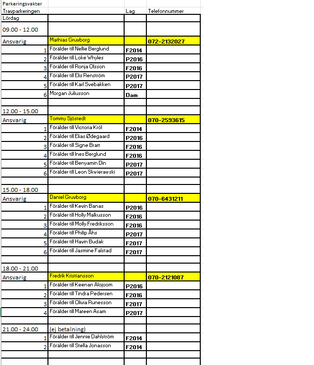 Man samlas vid ingågen till travet 10 minuter innan ens pass börjar för att få västar och information. Är det några frågor under dagen kan ni kontakta dem som står som ansvariga för ert pass.
