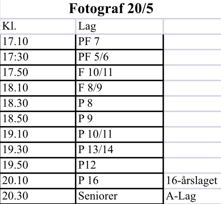 Hej! På måndag nästa vecka, 20/5, är det tid för fotografering på ip. Nedan följer ett schema för när varje lag ska fotograferas. Vid frågor kring fotograferingen ber jag er kontakta ansvarige för detta, Johanna Möller. Hennes mailadres: johanna.moller@live.se Med Vänlig Hälsning Måns Nilsson, Fotbollens kansli Tollarps IF