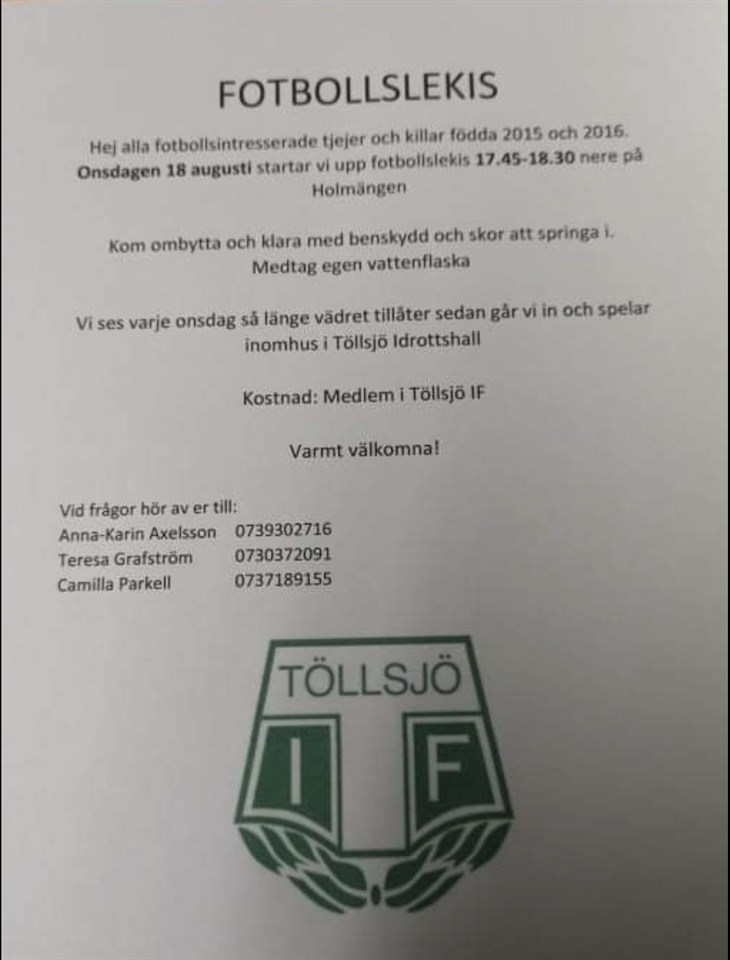 På fredag är det dags för Prova-på idrott igen Kl 18-19:30 i Töllsjöskolans idrottshall. Gäller barn i klass 3-7 Denna gång testar vi innebandy. Kom ombytta och glöm inte att ta med inneskor och vattenflaska. Välkomna gamla som nya deltagare Anna-Karin och Christer