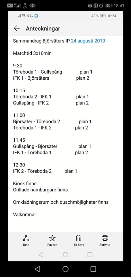 Här kommer lite information om helgens sammandrag, jag har bifogat ett spelschema hoppas det går att se. Det blir 3 st matcher, varje match är 30 min (3x10) första laget börjar spela 9.30. Så vi tar samling 9.00 i Björsäter eller 8.20 vid Töreshov. Beräknad sluttid 13.00. Ni som åker direkt skriv gärna det i tråden. Skall finnas kiosk( hamburgare) öppen. Vi tar med matchkläder. Tänk på kläder efter väder. Ev nåt mellanmål. Skor och benskydd. Vi syns på lördag.! P14 19 aug 2019 13kommentarer