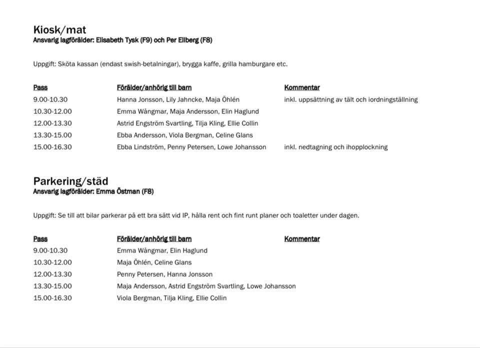 Hej Här kommer schemat för passen till kiosk och parkering/städ för Torscupen på Torsångs IP den 24/9 Ni föräldrar ansvarar själva för att se till att era pass är bemannde eller ser själva till att byta med någon annan. Om ett byte sker så informera den ansvariga lagföräldern, vi vill ha koll på vem som dyker upp. Med vänlig hälsning, Tränarna och lagföräldrarna F 11 ( 2014 ) 26 aug 2022 0kommentarer