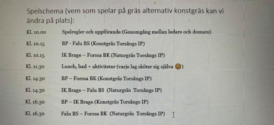 I torsdags var det sista träningen innan uppehållet och morgon spelas de sista matcherna mot Ludvika och Leksand. Sen drar vi igång 3/8 igen! Ni som har barn som spelar både matcherna i morgon får gärna skicka med dem något ätbart som går snabbt att få i sig för att ladda lite energi mellan matcherna. I morgon anordnar även Brommapojkarna en cup på IP för pojkar -08. Forssa, Brage och Falu BS är inbjudna och kommer att spela matcher mot dem. Publik är välkomna så känner ni för lite fotbollsfest så titta förbi och se någon match eller två! Matchschemat ligger med här. De som inte är med i morgon önskar vi en underbart skön sommar så ses vi igen i augusti! P 13-14 ( 2011-12 ) 2 jul 2021 0kommentarer