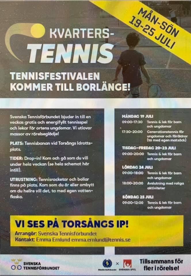 Nu under vecka 29 anordnar Svenska Tennisförbundet Tennisfestival på tennisbanan på IP! 🎾 Svenska Tennisförbundet genomför satsningar för att rusta upp ett antal banor i Sverige och turen har kommit till banan i Torsång. Den har nu rustats upp vilket firas med gratis tennis hela veckan! Se tider och aktiviteter på schemat. All utrustning finns att låna på plats så det är bara att dyka upp. En jättebra chans att få spela tennis och att kanske prova på en ny sport! P 13-14 ( 2011-12 ) 17 jul 2021 0kommentarer