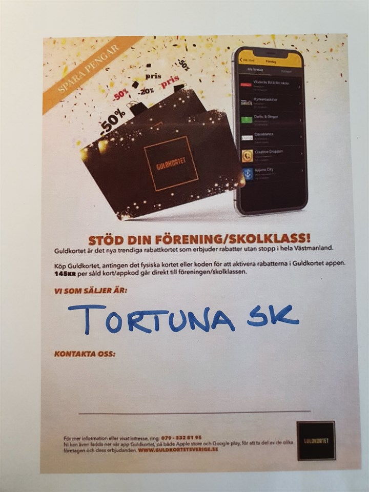 TSK säljer i år Guldkortet. Detta kommer ske genom alla lag i föreningen. Så är ni intresserade och vill köpa så hör av er till klubben. Guldkortet finns i app eller kort, kostar 295kr/st. Består av många olika erbjudanden och rabatter från olika företag. Man kan nyttja rabatterna hur många gånger som helst finns inget max antal. Tortuna SK 12 feb 2020 0kommentarer