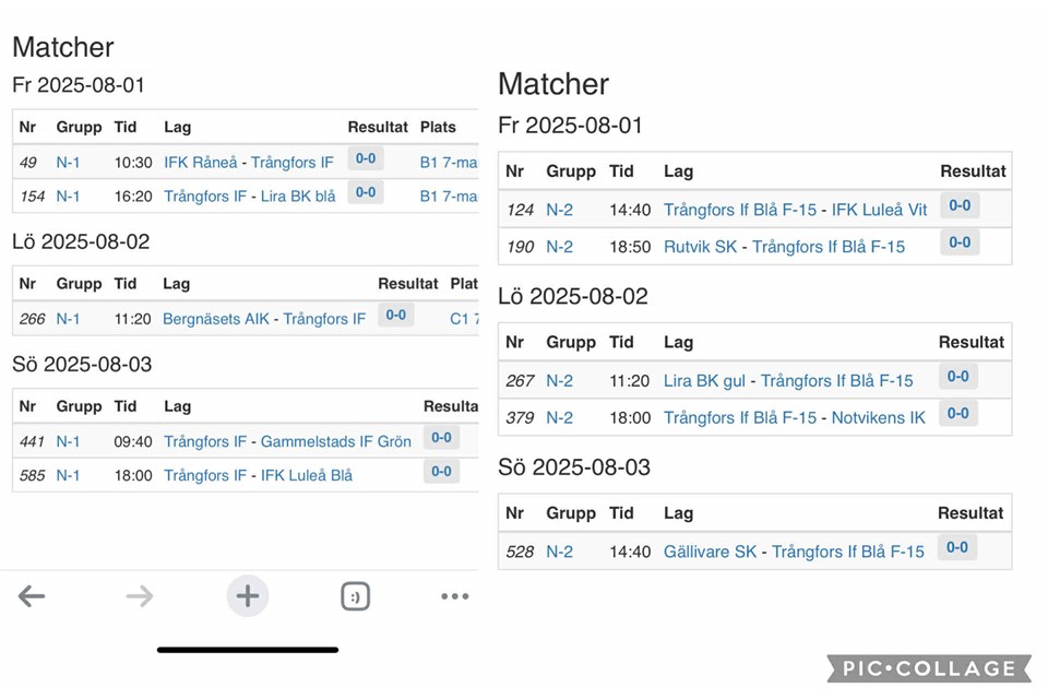Samling 30 min innan varje match vid respektive plan. Information finns i ett utskickat sms.