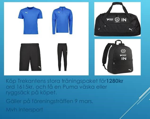 Hej, Den 9 mars kl. 10-11 kommer Intersport till Trekantens Sporthall för att visa kläder som man kan beställa. Den är direkt efter våran träning så bara för er föräldrar att komma in och hjälpa era tjejer att prova och beställa. Intersport har ett erbjudande, se bild, vid köp av stora träningspaketet för 1280kr (ord. 1615kr) får man en Puma väska eller ryggsäck på köpet. PS. Ikväll är det tränings i Smedby utomhus kl.17.30-19.00, jag har två platser i min bil. Vem ska med? Samling vid Trekantens Sporthall kl.17.00. Skriv en kommentar nedan :) // Maria