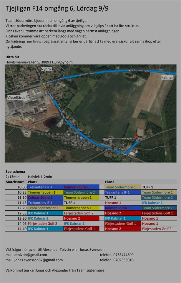 Hej, Nu på lördag är det den sista tjejligan. IFK Kalmar är arrangör. Vi kommer spela 2x13 min. Samling Åvallen kl.12.15 kl.13.20 IFK Kalmar 2 - Trekanten (Plan 2) kl.13.55 Team Södermöre 2 - Trekanten (Plan 3) Paus kl.15.05 Madesjö 3 - Trekanten (Plan 3) Ta med matsäck så tjejerna orkar spela alla tre matcher. Godis och läsk får bli efter matcherna. Så vänligen när ni läser detta, svara på om ni kan vara med eller inte i kallelsen. På torsdagens tränings ska vi ha fokus på hur vi jobbar som bäst under en match. // Maria