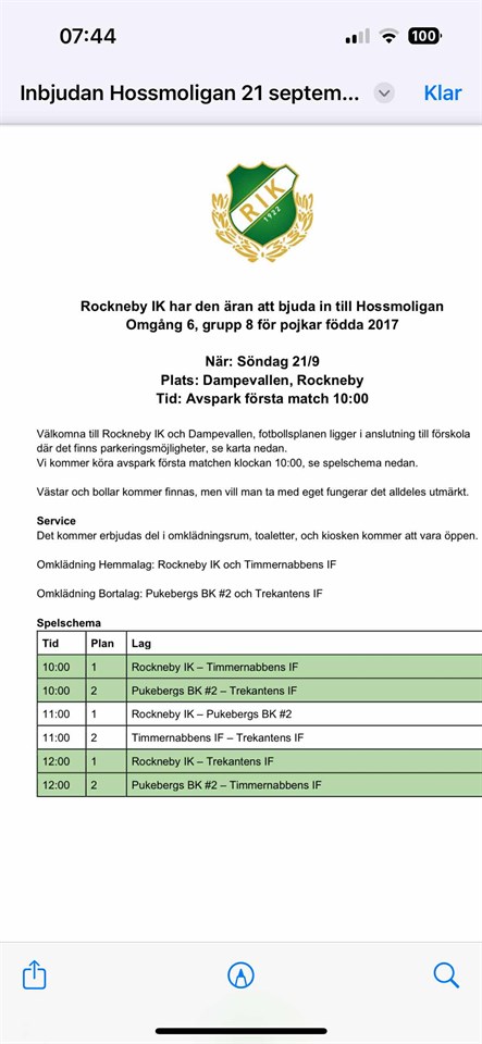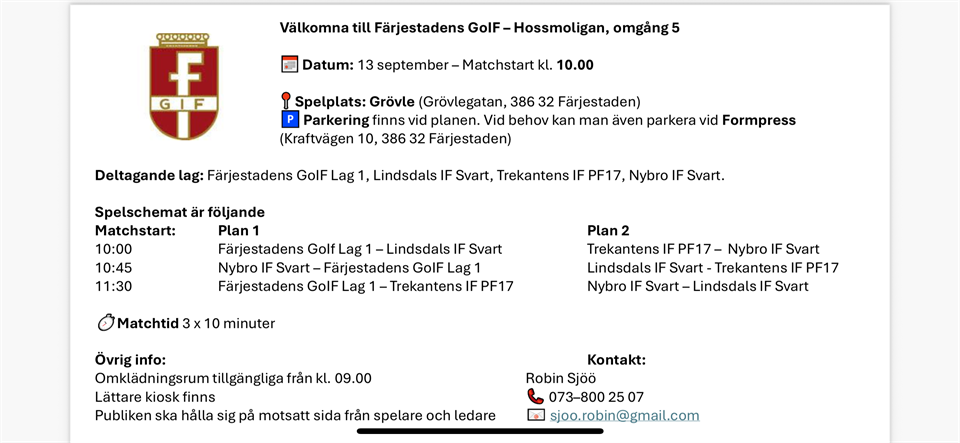 Hossmoligan omgång 5 i Färjestaden 13/9 Plats: Grövlegatan, 386 32 Färjestaden. Parkering finns vid planen. Vid behov kan man även parkera vid Formpress (kraftvägen 10, 386 32 Färjestaden) Samling kl:09.00 Vi byter om och duschar på plats. Matcherna startar kl:10.00 Lättare kiosk finns Spelschema: Kl 10.00 plan 2 Trekantens IF - Nybro IF svart Kl:10.45 plan 2 Lindsdals IF svart - Trekantens IF Kl: 11.30 plan 1 Färjestadens GoIF - Trekantens IF