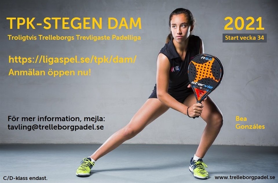 Nu äntligen kan vi starta vår damliga TPK-stegen Dam för alla glada och tävlingssugna amatörtjejer! Vi spelar på PDL Center Trelleborg, och omgången startar vecka 34. All information, kostnader och anmälan finns på: https://ligaspel.se/tpk/dam/ Anmäl snarast för att säkra plats! Även "vanlliga" TPK-stegen kommer starta vecka 34. Anmäla till denna görs via https://ligaspel.se/tpk/padel/ Hälsningar, Trelleborg Padelklubb